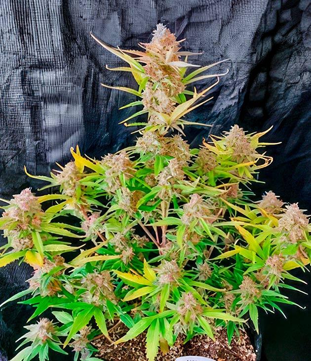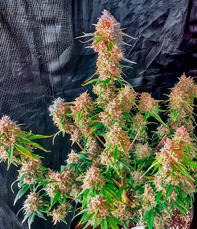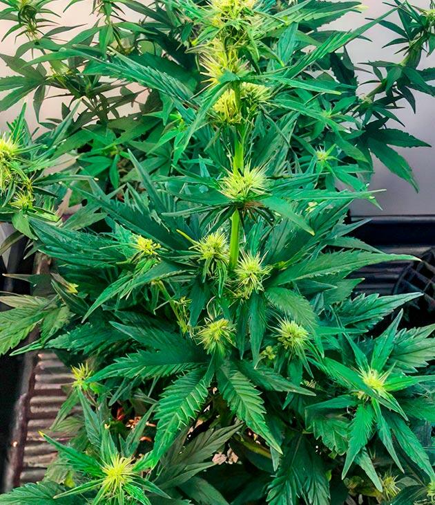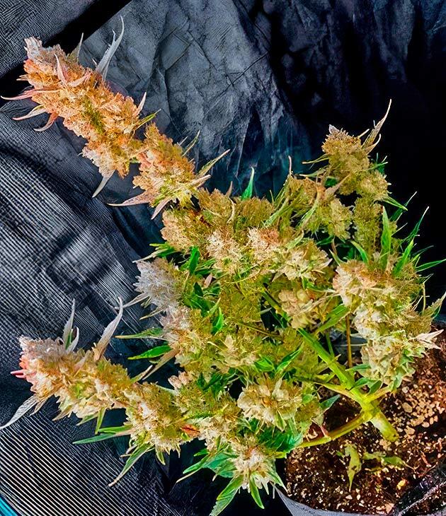 Общее состояние кустов отличное. Шишки становятся объёмнее, всё больше участков покрывается блестящей смолой, а запах стал намного насыщеннее. Он ощущается сразу при открытии бокса и быстро заполняет помещение. Чувствуется, что финиш уже не за горами, растения полностью переключились на созревание, и осталась только финальная часть этого цикла.