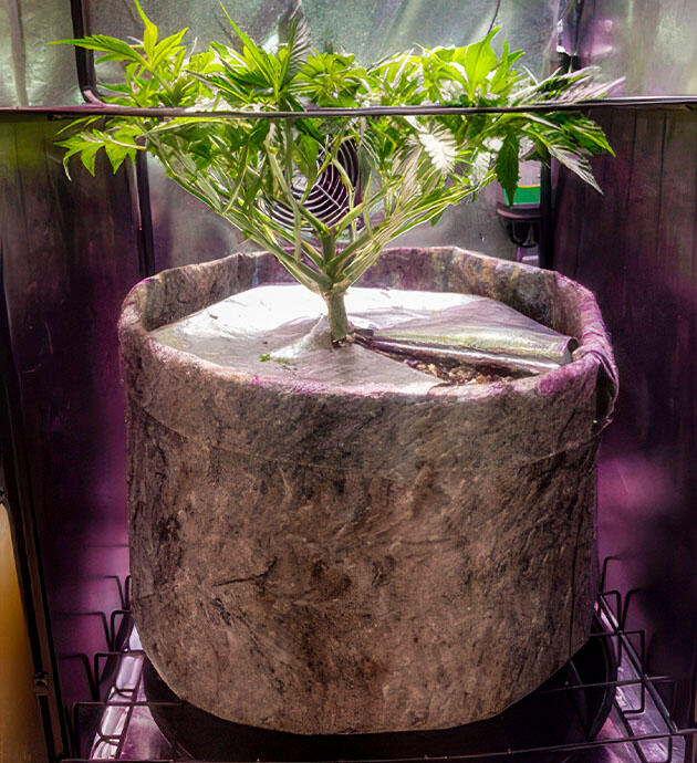 На 51-й день от посадки я провёл масштабную дефолиацию. После нее растение стало выглядеть более «открытым», структура кроны стала более светопроницаемой, а будущие соцветия получили максимум доступа к освещению и питанию. Растение быстро адаптировалось к новым условиям без каких-либо признаков стресса и продолжало развиваться по плану.