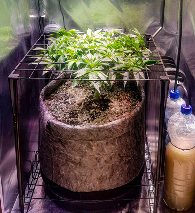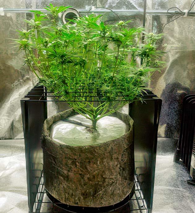 С началом третьей недели вегетативного периода я провел очередную, уже финальную пересадку растения, на этот раз в просторный горшок объемом 30 литров. На этом этапе я также провел топпинг, тренировку, направленную на стимуляцию боковых побегов и равномерное распределение энергии растения. Одновременно с этим установил сетку для ScrOG, которую заранее подготовил. Хочу с помощью этих двух техник равномерно распределить ветви по горизонтали и контролировать высоту растения. После всех этих процедур растению потребовалось усиленное питание. С этого момента я увеличил концентрацию удобрений, продолжая использовать продукты линейки Advanced Nutrients: