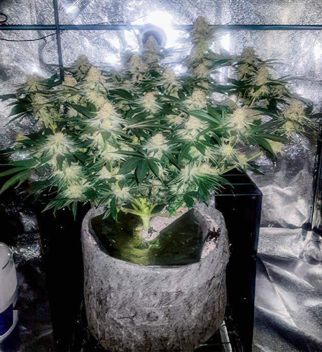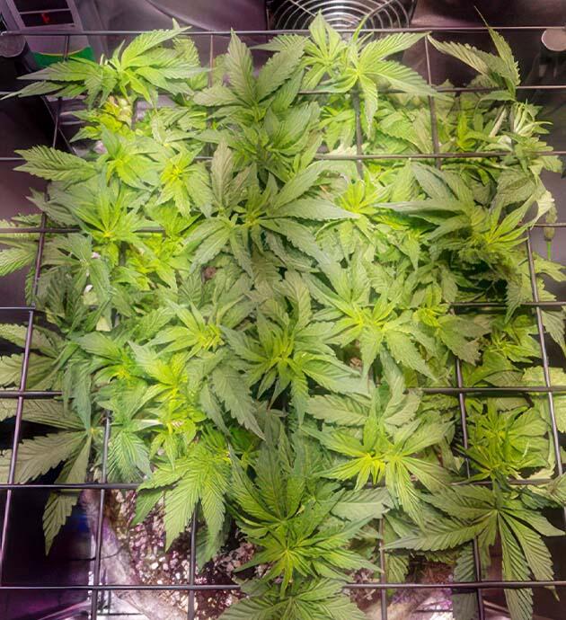 Суммарная нагрузка по питательному раствору значительно возросла, однако куст адаптировался без признаков стрессовой реакции. Листья остались насыщенно-зелёными, края не подкручиваются, прожилки чёткие, визуально видно, что питание усваивается корректно. На текущем этапе основная задача – поддерживать стабильные параметры микроклимата, следить за уровнем EC и pH и наблюдать за динамикой формирования шишек. Начало цветения прошло гладко, и всё указывает на благоприятный прогноз по урожайности.