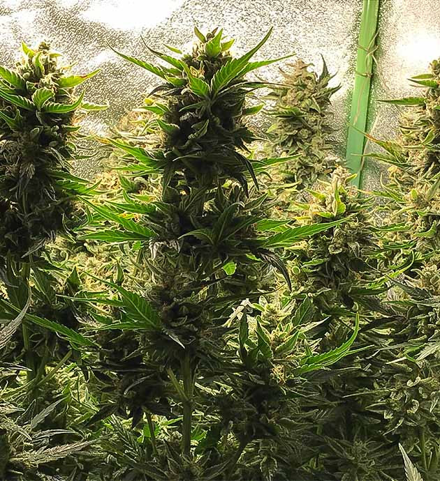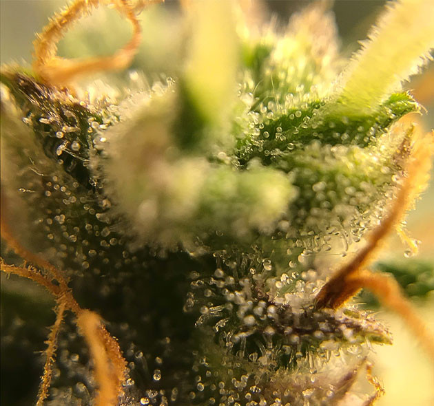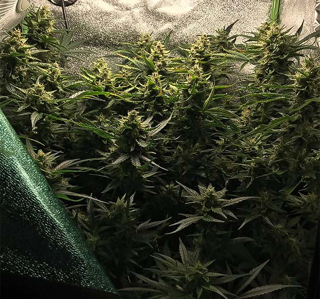 В середине одиннадцатой недели я проверил трихомы, прозрачных практически не осталось, около 15 % янтаря, остальные мутно-молочные. Вылил под корень 5 литров ледяной воды, после чего выключил свет на 48 часов, чтобы шишки выработали на фоне такого стресса последнюю порцию смолы.