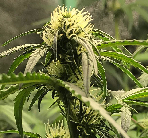 На верхней листве появились пятна, но это точно следствие светового ожога. Повреждены только те части растения, которые находятся ближе всего к борду. Главное, чтобы в шишках не начали формироваться «бананы» и куст не стал гермафродитом.