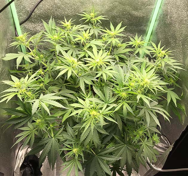 Lemon Pie Auto – настоящий гигант. Я даже не знаю, это настолько мощный сорт или мне попался фенотип-акселерат. Уже к этому моменту он практически заполнил гроубокс. Из-за этого я не могу отвязать ветки и дать им свободно тянуться. Боюсь, в таком случае мне придётся их надламывать, а делать этого я не хочу категорически. За пятую неделю растиха увеличилась в размерах как минимум вдвое. Листва приятно пахнет и оставляет после себя липкий налёт на руках. Исходя из размеров куста, начал лить по 4 литра за раз, то есть раз в 2-3 дня в зависимости от состояния верхнего слоя почвы. Один раз дал компот с прежними компонентами и Terpinator. Также снизил влажность до 50 %. Не хватало на таком роскошном кусте поймать плесень. К концу недели шишечки украшали всю крону.