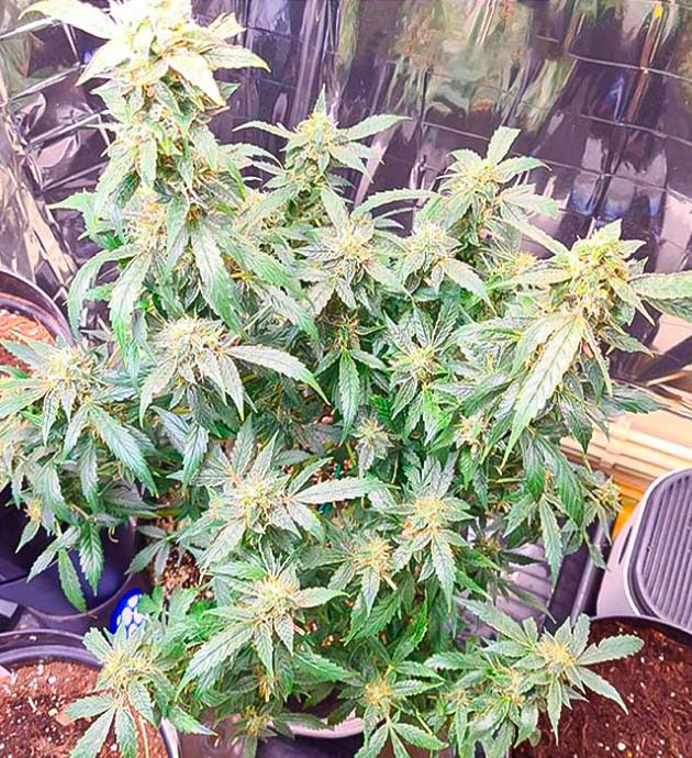 На этой неделе появился отчетливый запах. Собственно, он и раньше был, но какой-то невнятный и, я бы сказал, фоновый, нейтрально-травянистый. Сейчас же аромат стал более ярким и обращает на себя внимание. Тон определенно цитрусовый, как и обещал производитель. Соцветия и сахарные листья покрываются сахаром трихом, а стигмы подсыхают и становятся ярко-оранжевыми, словно апельсиновая кожура. Кустик стал настоящим водохлебом. Лью ему по 2,5 литра за раз, и он выпивает все за два-три дня. Подкормка по прежней схеме.