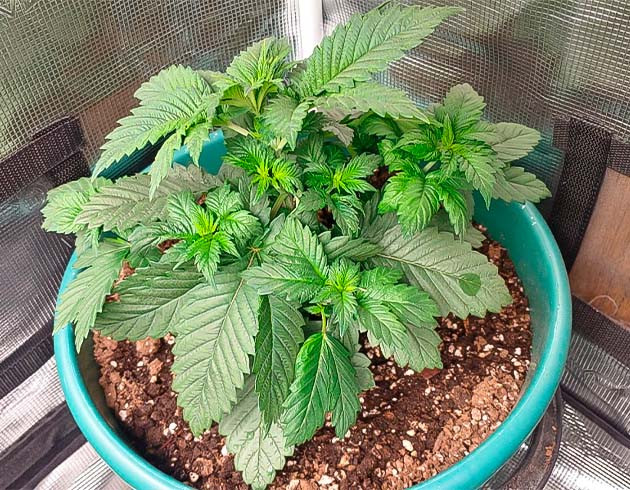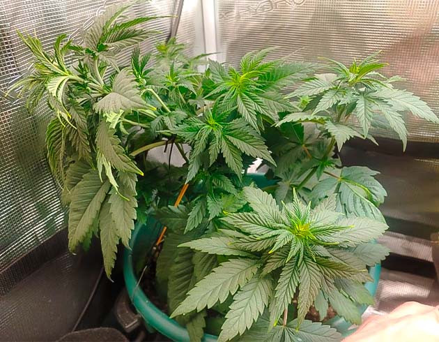 Что касается питательного режима, то я использовал органическое удобрение BioBizz Grow в концентрации 2 мл на литр воды в сочетании с 1 мл Simplex Osmos (который является аналогом калмага). Такую питательную смесь растение получало дважды в течение вегетативного периода. В остальное время, когда почвенный субстрат подсыхал, я проводил поливы обычной водой с добавлением только калмага. По реакции растения было заметно, что оно предпочитает умеренное количество питательных веществ и негативно реагирует на избыток удобрений.