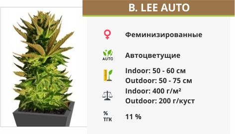 Штамм B. Lee Auto с жизненным циклом в 60-65 дней. Он не убиваем и подходит для гроверов-новичков. Вытягивается в высоту на 50-75 см. Наделен ярко выраженным фруктовым ароматом. Содержание ТГК в сорте 11%. Эффект сбалансированный. Сначала приходит убойный драйвовый хай, а затем расслабляющий стоун. Эйфория накатывает волнами и отправляет носителя в мир блаженства.