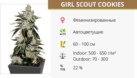 Сорт конопли Girl Sсout Cookies Auto fem - легендарный калифорнийский гибрид, прославившийся уникальным вкусом свежеиспеченного печенья. Его шишки приносят убойное многогранное воздействие, переполняющее бодростью и позитивом. Также стоит отметить приличный показатель урожайности в 500-650 г готового продукта с 1 м2.
