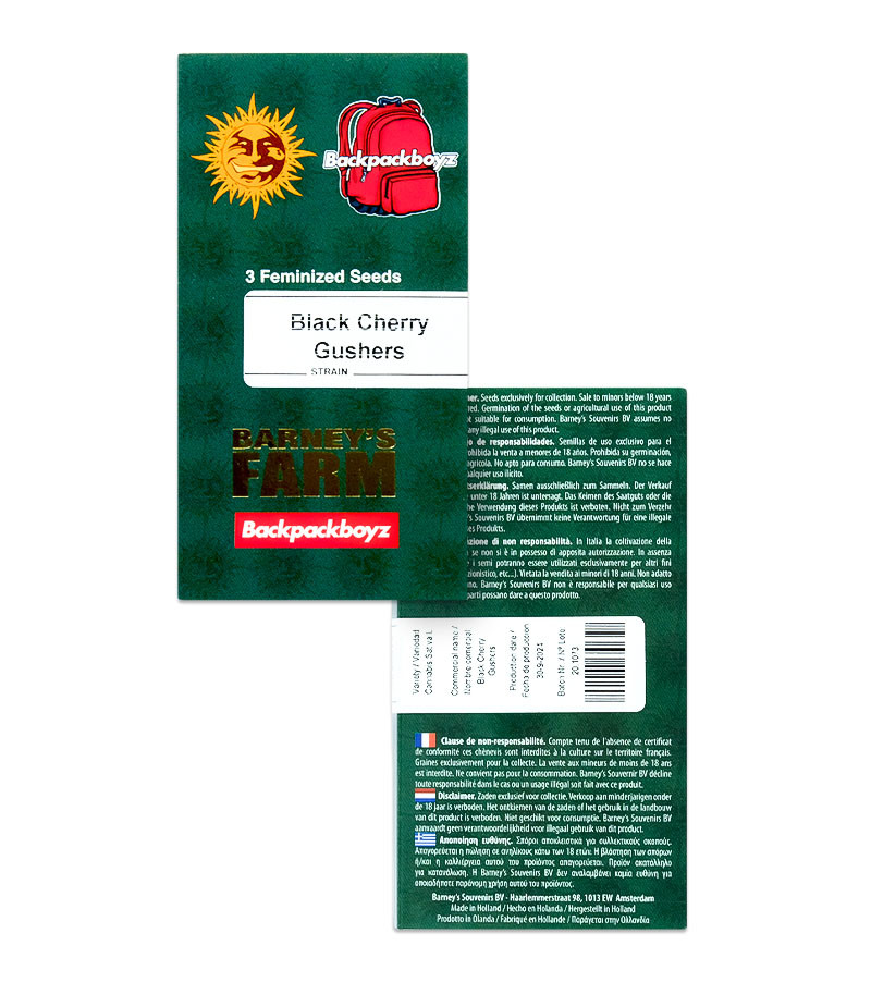 Сорт конопли Black Cherry Gushers является физическим воплощением всех заветных желаний гровера. Соединив свои навыки и генетические наработки, гиганты индустрии каннабиса Barney's Farm и Backpack Boyz создали сверхустойчивый, плодовитый и невероятно пахучий гибрид для самого широкого круга пользователей. Чтобы произвести на свет нечто необычное, мастера селекции использовали для скрещивания сразу два редких сорта с ягодными ароматами. Первый – экзотический Acai, имеющий кисло-сладкий освежающий вкус, а второй – нежный Black Cherry Funk с завораживающим темным окрасом, гармонично дополнивший терпеновый профиль запахом спелой вишни.