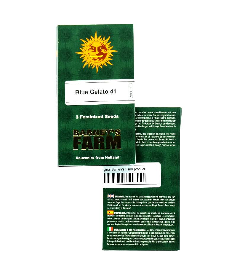 Сидбанк Barney's Farm вывел сорт конопли Blue Gelato 41, скрестив три культовых гибрида. Первый «родитель» в лице титулованной Blueberry не нуждается в представлении, ценители марихуаны прекрасно помнят ягодный аромат «Черники». Второе растение, использованное в ходе селекции, – Thin Mint Girl Scout Cookies – является самым популярным среди представителей генетики Girl Scout Cookies. Наконец, Sunset Sherbert подарил Blue Gelato 41 нотки цитрусовых во вкусоароматическом букете. Хотя в генетике получившегося гибрида доминирует индика (60% против 40% генов сативы), «Мороженое» по своему росту, урожайности и воздействию больше напоминает сативный сорт.