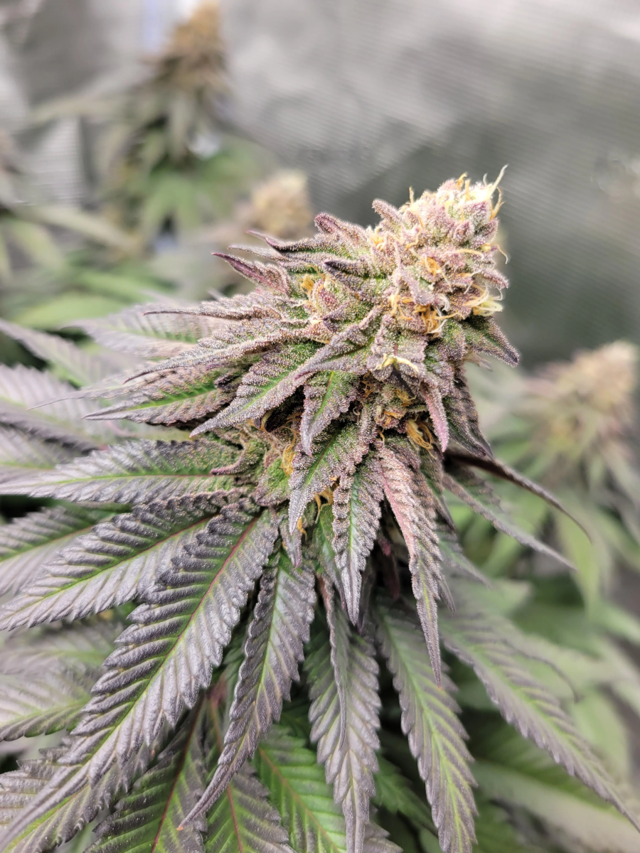 Гибридная сила каннабиса ярко проявляется в процессе развития посадки. Кусты хорошо разрастаются и в высоту, и по сторонам, шурша густой зеленой листвой. В условиях небольшого помещения вегу можно завершать уже через месяц от появления всходов. За последующие недели растение успеет хорошо заполнить отведенное ему пространство даже без вмешательства со стороны гровера. Полная фаза цветения занимает 60-63 дня. Ближе к концу этого периода конопля начинает быстро темнеть. Сперва пурпур и фиолетовые краски захватывают только кончики верхних листочков, а к моменту харвеста аналогичной гаммой заполняется вся крона от верха до низа.