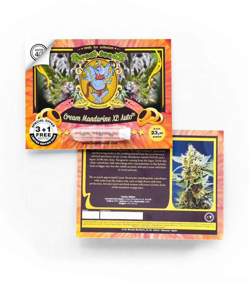 Cream Mandarine XL – автоцветущий сорт каннабиса, который отличается энергичным ростом и высокой урожайностью. Селекционеры испанского сид банка Sweet Seeds вывели этот гибрид с помощью скрещивания таких сортов, как Cream Mandarine Auto и элитного клона Super Thai 98.