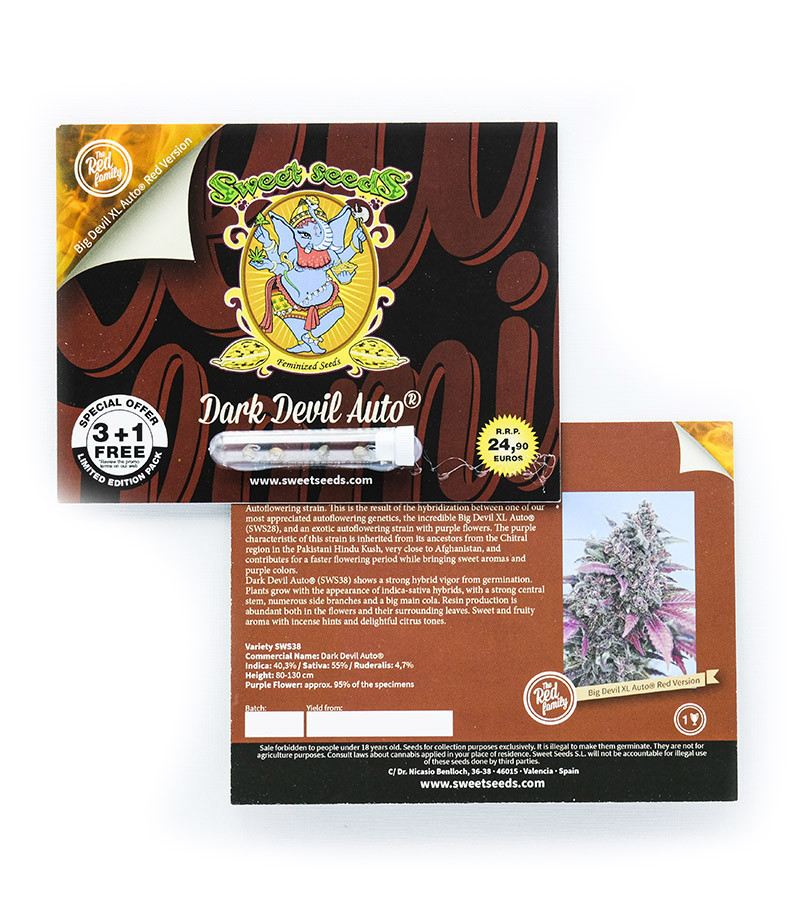 Dark Devil – автоцветущий гибрид, созданный на базе Big Devil XL и экзотической культуры с соцветиями пурпурного окраса. Невзирая на грубое мужское имя, Dark Devil – 100% девочка. Штамм был феминизирован. Генетика второго родителя позволила сократить срок вегетации, прикрасила характерным цветом и добавила во вкус Big Devil XL новых оттенков.