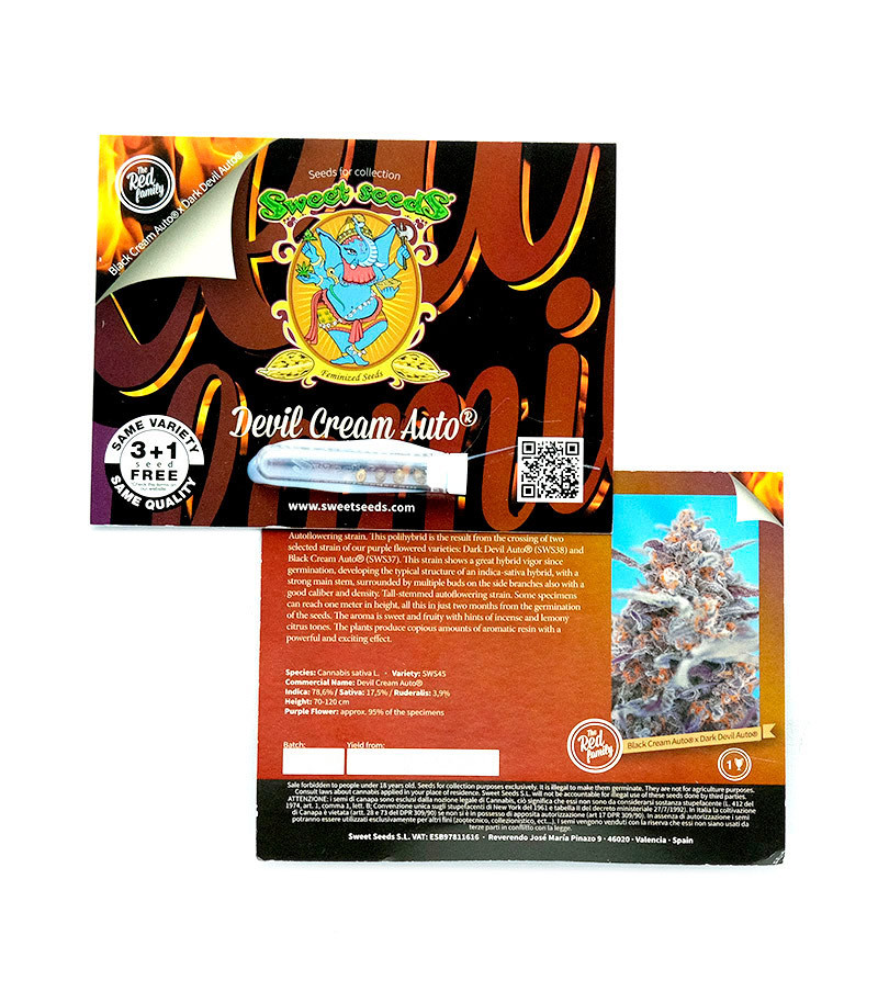Devil Cream Auto – автоцветущий каннабис от SweetSeeds. Гибридная культура была выведена путем скрещивания Dark Devil Auto (заводская маркировка – SWS38) и Black Cream Auto. Растишка пользуется спросом не только на территории солнечной Испании. Он обрел популярность далеко за ее пределами.