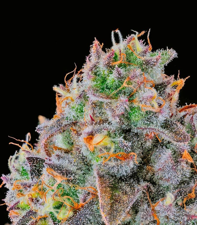 Цветение Fruit Riot в комфортной среде длится 8-9 недель. Именно в этот период происходит настоящее волшебство. Прежде зеленая листва постепенно наполняется фиолетовыми и розовыми переливами, а шишки утопают под слоем густых трихом. Смола образует плотное кристаллическое покрытие, из-за чего растения выглядят так, словно их припорошили сахаром.