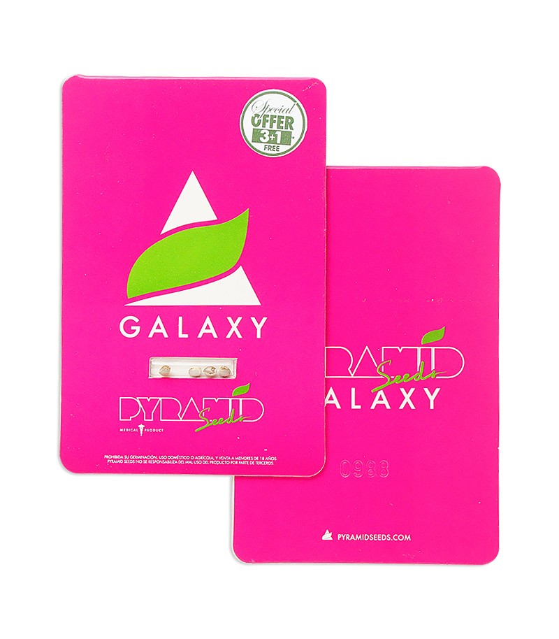 Galaxy – относительно молодой штамм в коллекции Pyramid Seeds. Сорт был выведен путем скрещивания Afghani с собственной разновидностью Northern Lights. В конце селекционеры получили гибридный феминизированный Galaxy.