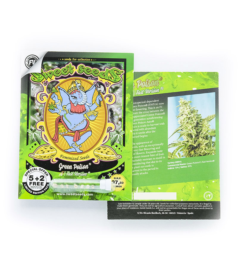 Green Poison F1 Fast Version – модификация Green Poison, одного из флагманов Sweet Seeds. Это штамм с экстремально быстрой скоростью роста и цветения. Культура прошла феминизацию, но не принадлежит к классу автоцветов.