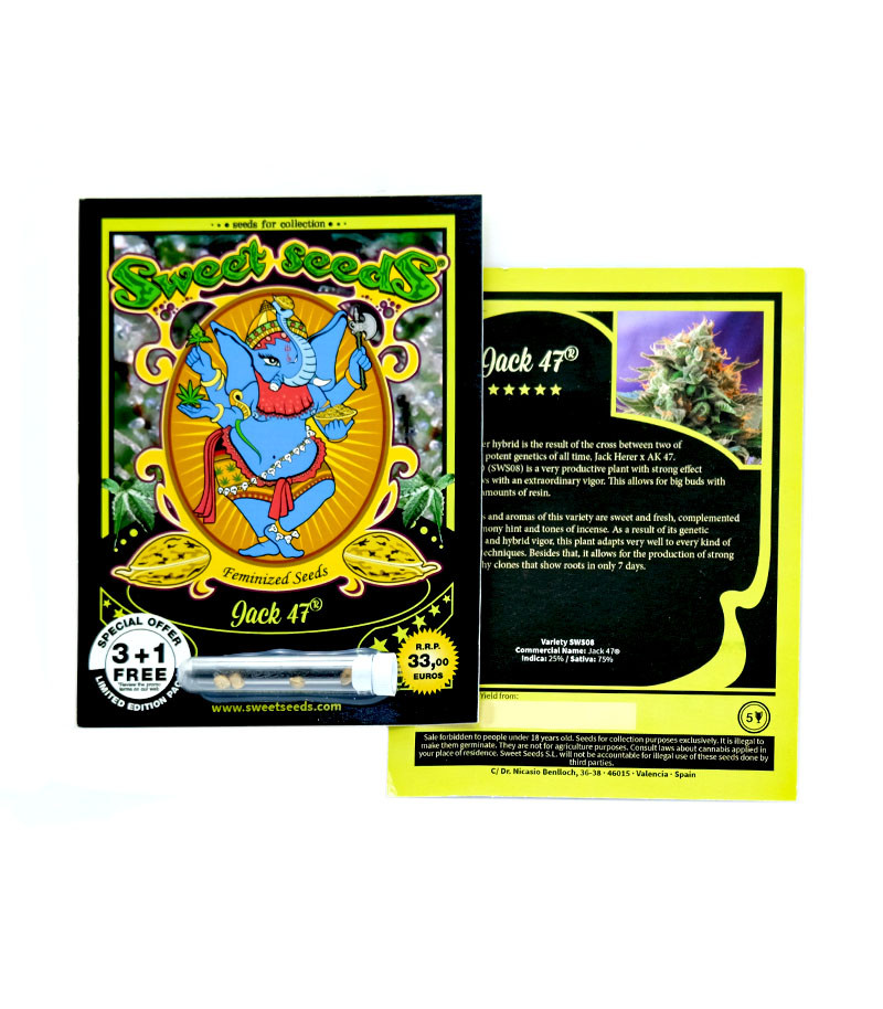 Довольно часто можно услышать хвалебные речи о сорте каннабиса под названием „ Jack-47”. Действительно, он считается одним из лучших гибридов,сохранивших в себе лучшие качества своих предков. Компания Sweet Seeds получила этот фенотип путем скрещивания двух именитых сортов: Jack Herer и АК-47. От своих предков, это растение и получило свое имя. За короткое время Jack-47 завоевал сердца покупателей и обрел большую популярность. Об этом говорят его численные награды и премии, среди которых самой главным достижением является первые места на Summer Cup - 4º и Edición Copa Cannabica Canaria – 2011.
