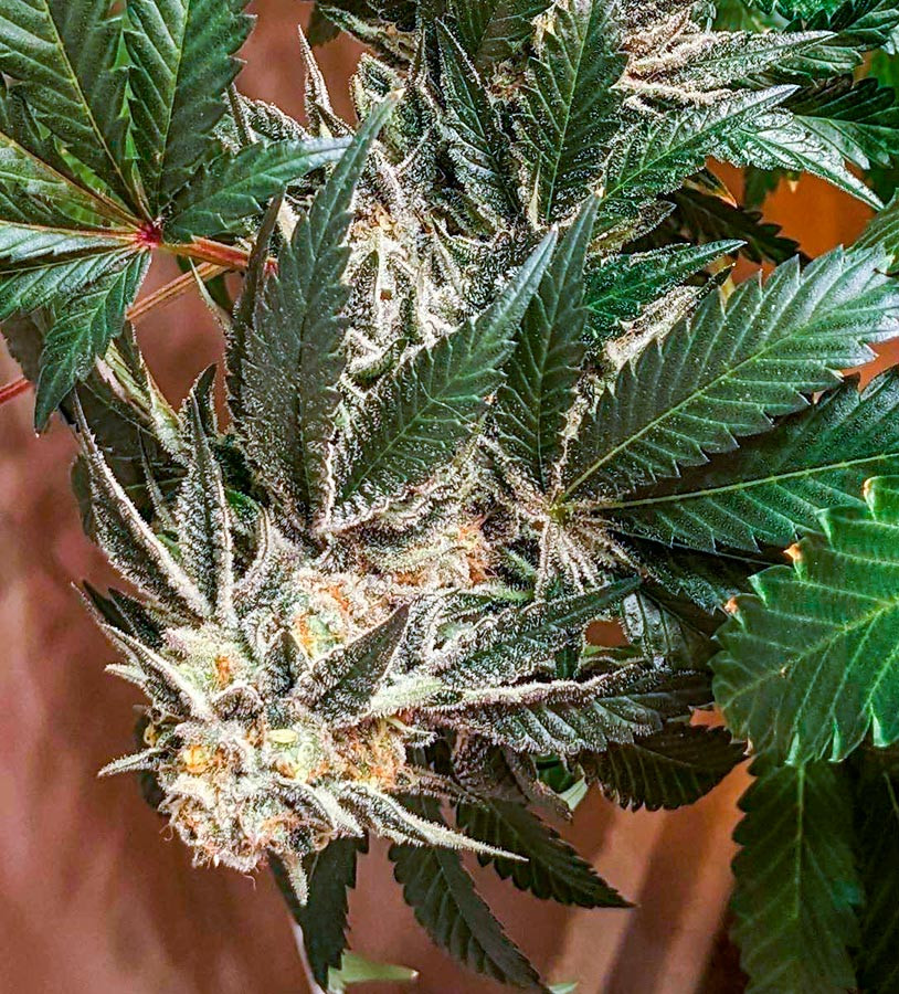 Плотные зеленые шишки с пурпурными оттенками Jungle Lava при созревании покрываются красивыми оранжевыми волосками. Толстый слой ледяных трихом придает бутонам морозный, почти белый окрас. Присутствие липкой смолы заставляет соцветия сверкать на свету переливом бриллиантов.