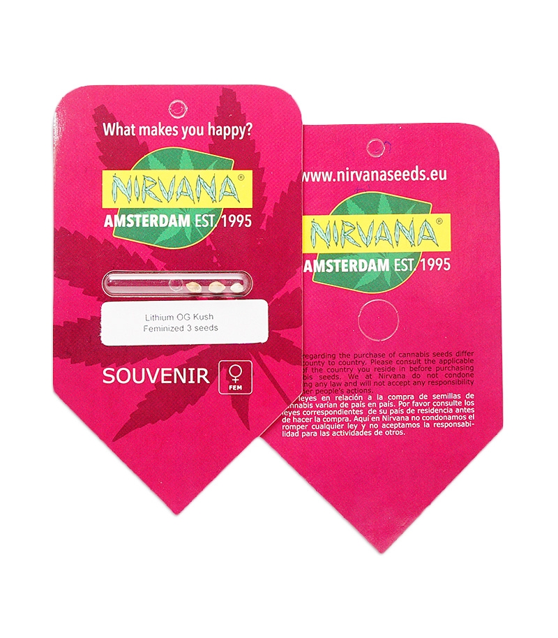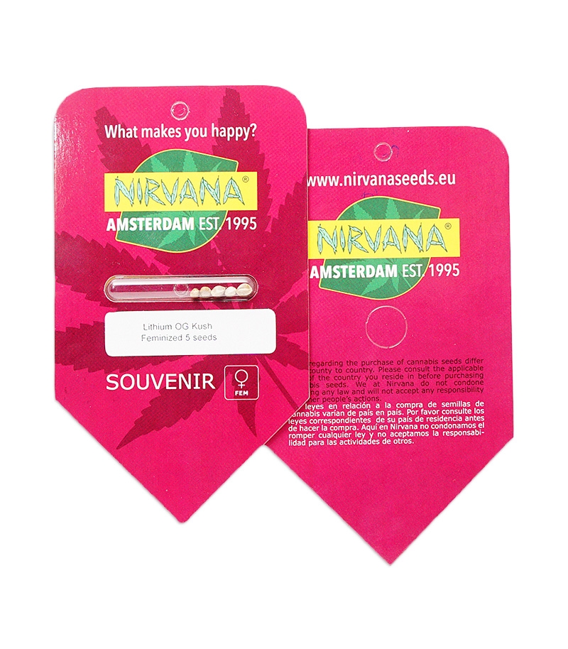 Название сорта Lithium OG Kush бридеры сид-банка Nirvana seeds дали в честь одноименной песни легендарной группы из Сиэтла, благодаря которой в свою очередь и появилось название этого сидбанка. Семена этого сорта без сомнений понравятся гроверам, выращивающим марихуану в медицинских целях – штамм обладает превосходными антидепрессантными и противотревожными свойствами. Бридеры по всюду искали исключительную «мамку» знаменитого сорта OG Kush и найдя, скрестили ее с одним из наиболее стабильных мужских растений сорта Master Kush. Оба штамма разделяют гены каннабиса Hindu Kush, поэтому повода для сомнений в успехе этого союза не было. Результаты не разочаровали.