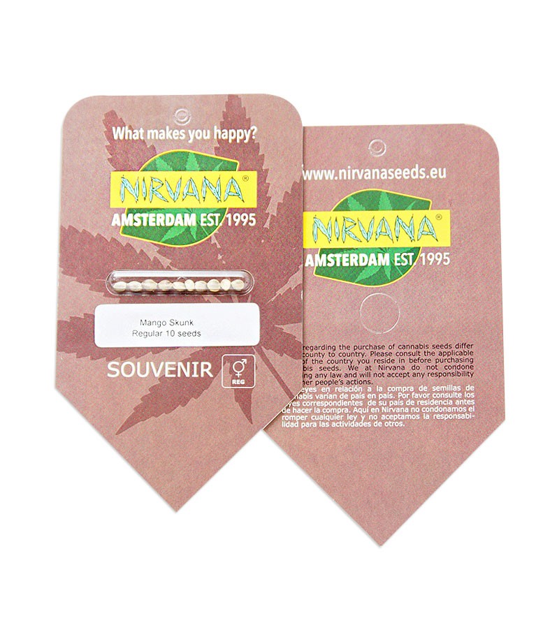 Высокоурожайный сорт конопли Mango Skunk regular выделяется своим сочным фруктовым ароматом с нотками корицы, в котором отчетливо доминирует привкус манго. Период цветения растишки продолжается 9-11 недель, а урожайность при культивации методом SOG составляет 450-550 г шишек с 1 кв.м.