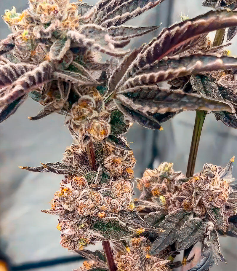 Изысканность и благородство генетики сорта отчасти выражаются и во внешнем виде экстравагантных шишек. В последние недели цветения они стремительно меняют свою цветовую гамму, окунаясь в темные фиолетовые, а местами в практически черные оттенки. На поверхности увесистых соцветий красуется толстый слой бриллиантовых трихом, который только подчеркивает бархатистость и эксклюзивность продукта.