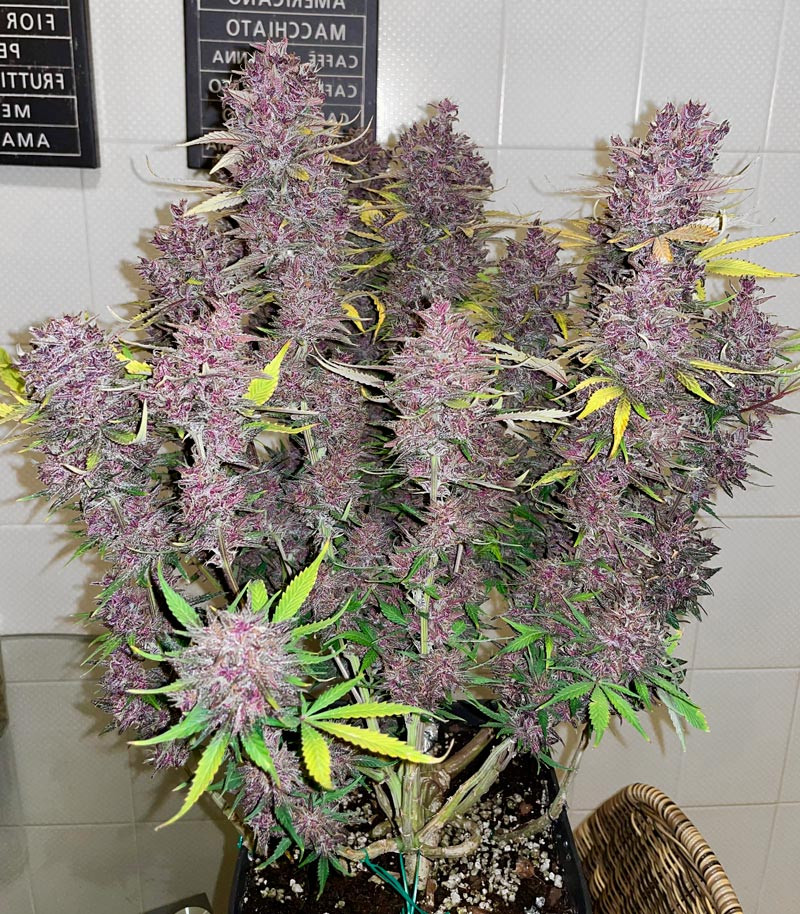 Кустики Purple Juice Auto растут быстро и не напрягают гровера капризами. Вытягиваются они прямо на глазах, соцветия наливаются стремительно. Весь жизненный цикл этого автоцвета укладывается в 65-70 дней. Быстрая вега и короткий период цветения, который начинается вне зависимости от светового цикла, дают возможность растениям созреть в столь краткий срок. При этом урожайность не страдает от такой скорости созревания. В закрытом грунте с одного квадратного метра получают 400-550 грамм шишек. При выращивании на улице с куста реально собрать 50-250 грамм готового продукта (до просушки, естественно). Фиолетовый оттенок начинает появляться на соцветиях на последних этапах развития. Особенно ярко этот эффект проявляется при колебаниях температуры с началом холодных ночей.