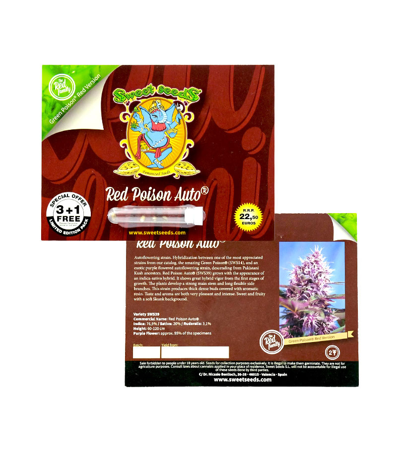 Red Poison Auto – штамм, который находится в тренде. Феминизированная версия автоцветущего Red Poison была выведена на базе одного из самых популярных сортов сид банка – Green Poison. Красные тона в окрасе растишки были взяты от пакистанской разновидности – Hindu Kush. Стоит отметить, что второй родитель знаменит своими пурпурными ароматными соцветиями.