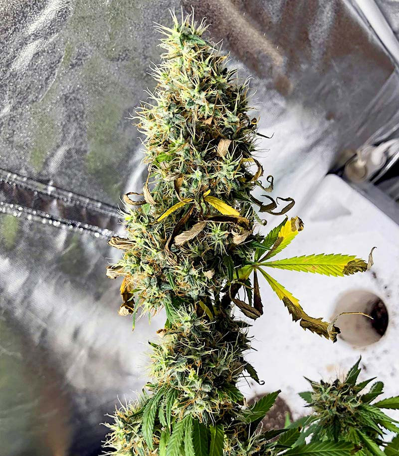 Однако в целом сорт Royal Runtz неприхотлив, поэтому без проблем адаптируется к любым неблагоприятным внешним факторам. В фазу активного цветения растения обрастают круглыми соцветиями фиолетового оттенка, которые покрываются ярко-желтыми волосками и слоем из блестящих трихом с ТГК. В зависимости от фенотипа листья могут менять окрас на фиолетовый или даже розовый. Особенно это заметно при уменьшении ночной температуры в гроубоксе.