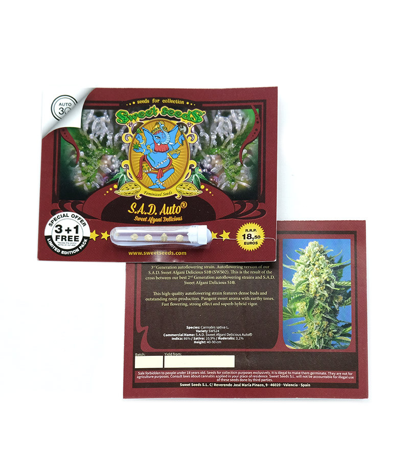 Семена конопли S.A.D. Auto (Sweet Afgani Delicious S1) подходят для культивирования в открытом грунте и в помещении. Кусты получаются невысокие, сорт автоцветущий, радующий хорошим показателями урожайности. Эффект расслабляющий, помогает бороться с болями.