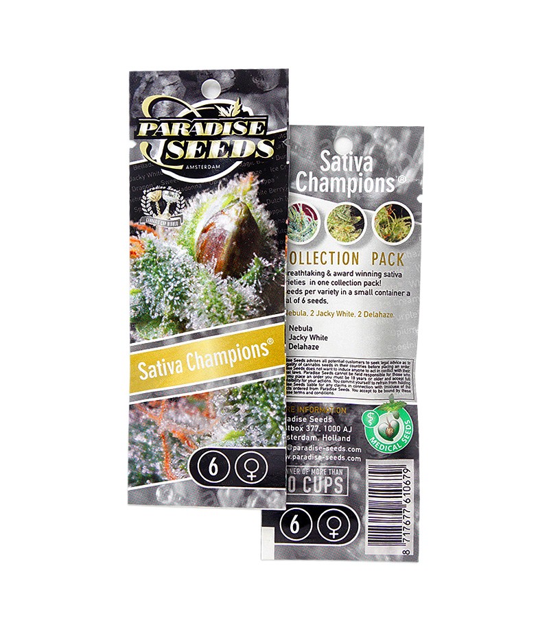 Микс семян Sativa Champions Collection Pack включает в себя три вида сативодоминантных сортов: Nebula, Jacky White, Delahaze – по два семени каждого гибрида. Невысокие и не прихотливые растения, для любителей хай эффекта и плотных шишек.