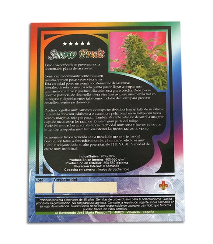 Snow Fruit – разновидность каннабиса с индиковой генетикой, что, несомненно, редкость для Sweet Seeds. Штамм отличается высокой производительностью и мохнатостью. Сорт доступен в феминизированной версии. Для культуры характерно явление полихромности- его листья окрашены в различные цвета. Листва пестрит пурпурными, красными и фиолетовыми оттенками.