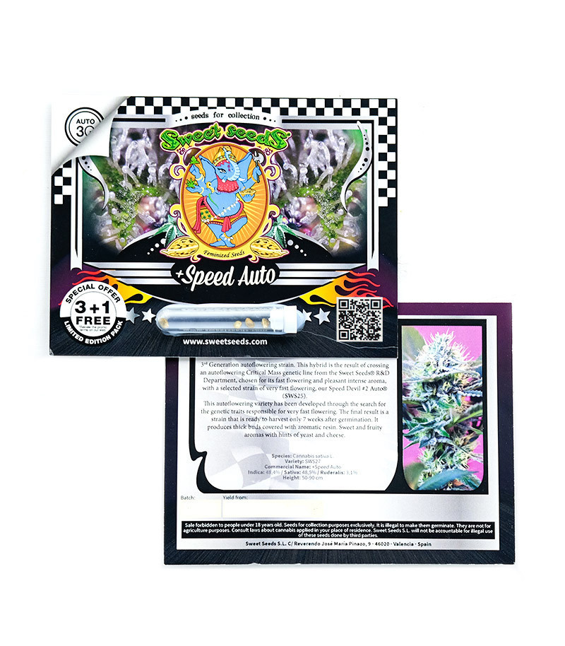 Speed auto – феминизированный автоцветущий сорт, родителями которого стали Critical Mass и Speed Devil #2. Селекционеры Sweet Seeds создали гибрид с завидной скоростью роста, который не оставит равнодушным ни одного любителя конопли.