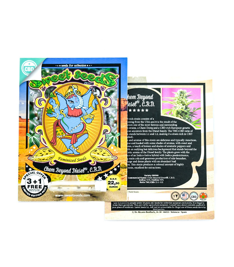 Сорт Chem Beyond Diesel CBD бридеры испанского семенного банка Sweet Seeds создали, отобрав два урожайных вида каннабиса. Выдающуюся марихуану из Америки Chem Dawg скрестили с Diesel CBD – сортом с высоким уровнем КБД европейской генетикой и американскими корнями семейства дизелей. Содержание ТГК в полученном результате составляет 5-12%, КБД – 8-15%.