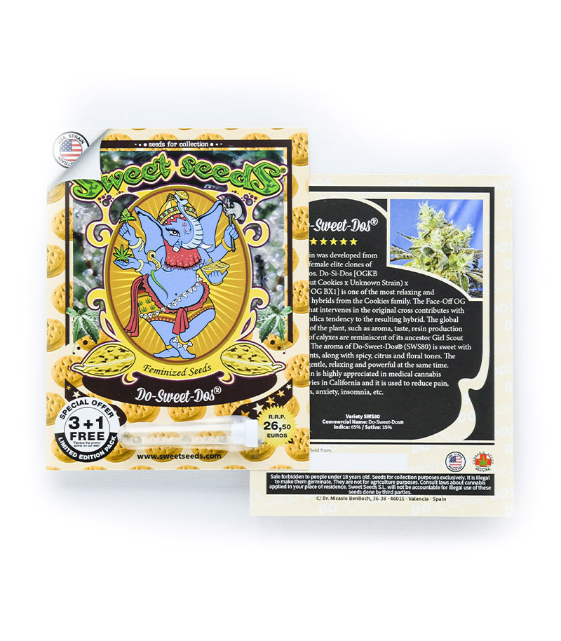Сорт конопли Do‑Sweet‑Dos – новинка 2019 года от испанского сидбанка Sweet Seeds. Для создания фотика использовались отборные клоны женских растений Do-Si-Dos и мужские экземпляры Face-Off OG. В результате был получен один из самых расслабляющих и ароматных сортов в линейке Cookies. Генетика Face-Off OG привнесла в оригинальный сорт большую Индичную составляющую, и теперь соотношение Индика/Сатива стало 65/35%. Содержание ТГК зависит от условий выращивания, и колеблется в пределах 17-24%. Основные характеристики нового гибрида, такие, как аромат, вкус, смолистость шишек и их размеры, напоминают родоначальницу всего благородного семейства – Girl Scout Cookies.