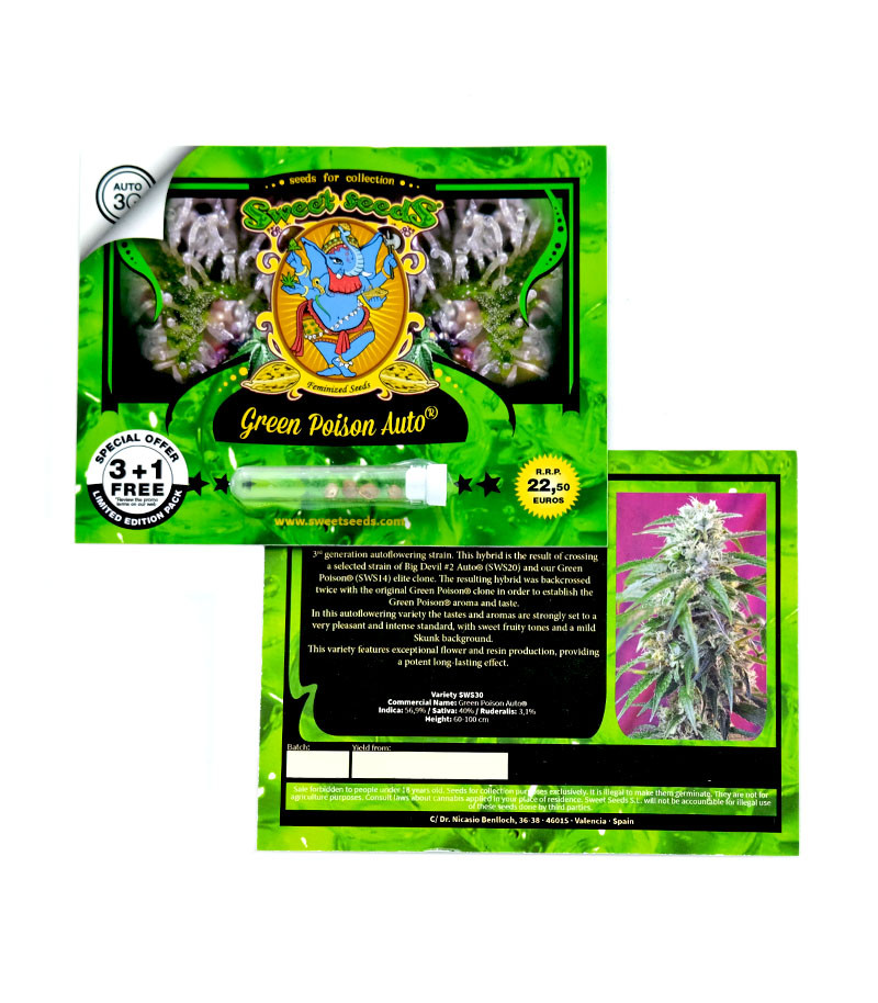 Сорт Green Poison XL Auto – более крупная и урожайная версия оригинального Green Poison Auto от сидбанка Sweet Seeds. Индика доминантный с ТГК 15-20% и КБД 0,07%. В индоре урожай достигает 450-600 г/м2 за 56 дней жизненного цикла, в ауте 60-250 г/куст. Аромат фруктовый с нотками сканка и орехов.