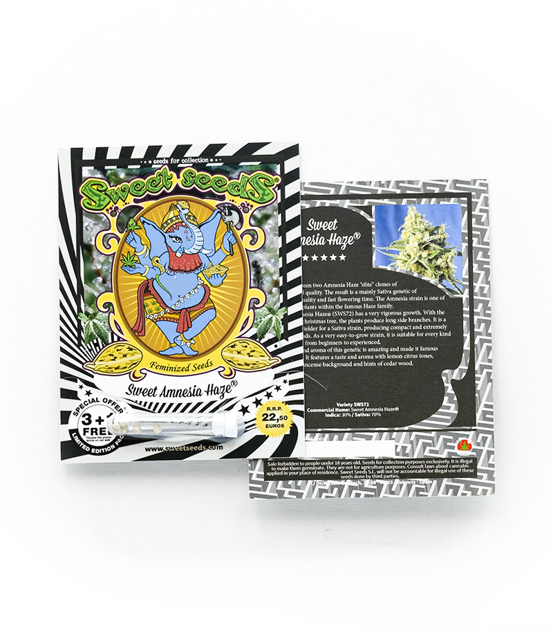 Бридеры сидбанка Sweet Seeds из Испании скрестили между собой два элитных клона Amnesia Haze, чтобы получить сорт Sweet Amnesia Haze. Этот сатива доминантный (70%) каннабис содержит ТГК 16-22% и КБД 0,1%.