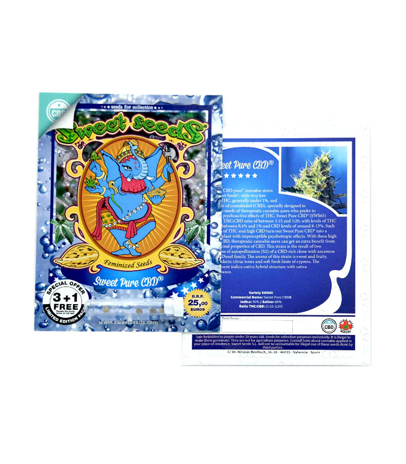 Сорт Sweet Pure CBD бридеры испанского семенного банка Sweet Seeds создали на основе генетики богатой КБД. Для этого использовалось двойное возвратное скрещивание клона S2 и материала сортов Дизеля, богатых КБД. Генетическая линия имеет соотношение ТГК:КБД от 1:15 до 1:20. ТГК в данном феминизированном каннабисе 0,4-1%!
