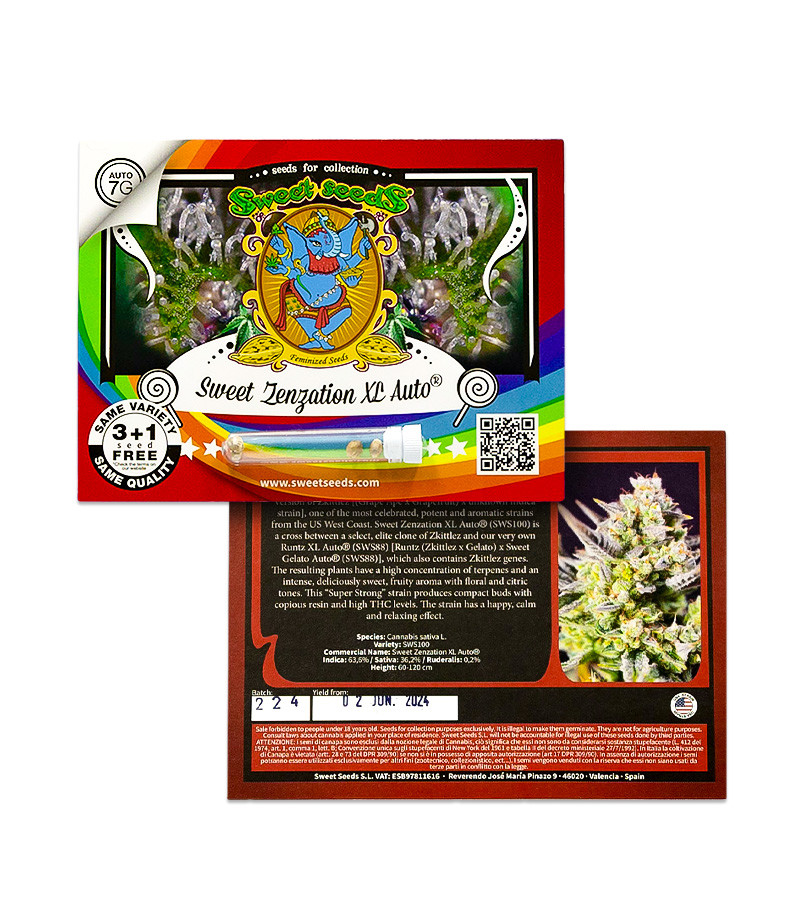 Индичный автоцвет Sweet Zenzation XL Auto – это практически чистокровный «американец», хотя и создан он бережными руками мастеров из солнечной Испании. Основа сорта – настоящий хит Западного побережья и титулованный чемпион Zkittlez (Grape Ape x Grapefruit). Поиски партнера для данной особи шли не один месяц, но в конце создатели все же остановились на собственной разработке под названием Runtz XL Auto, по венам которой также течет кровь Zkittlez. Быстрый и результативный цикл с таким растением гарантирован даже при отсутствии фундаментальных знаний в области коноплеводства.