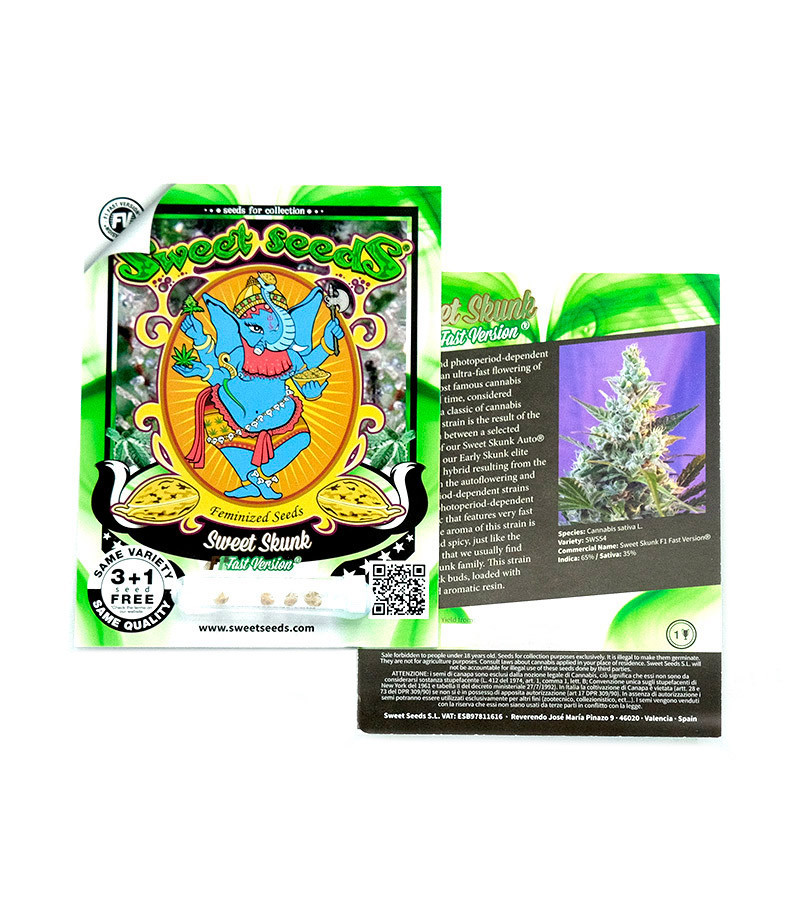 Присущий сканкам аромат, сохранился в фемке Sweet Skunk F1 Fast Version. Растишка радует насыщенной палитрой запаха и вкуса: классика марихуаны наполнена нотками сладостей и пряными тонами. А мощный эффект, который уже называется сканковым, понравится всем, кто хоть раз пробовал одного из родственников культуры.