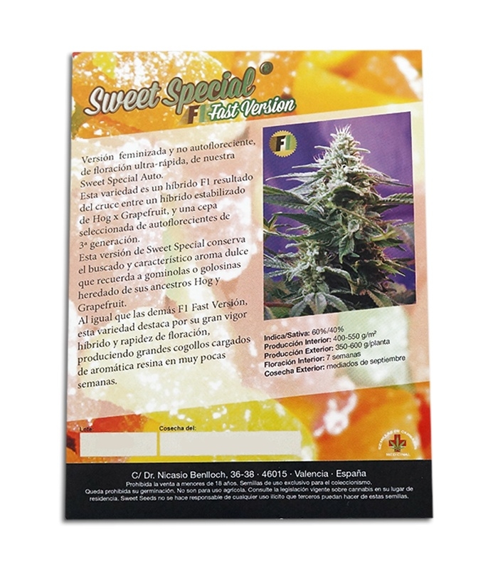 Селекция Sweet Spesial Fast Version проходила при участии Cream Caramel Auto (третье поколение) и промежуточного гибрида – HOG x Grapefruit. Сорт вкладывает все силы в интенсивность роста, экстремально быстрое цветение, а потому он не нуждается в автоматическом цветении.