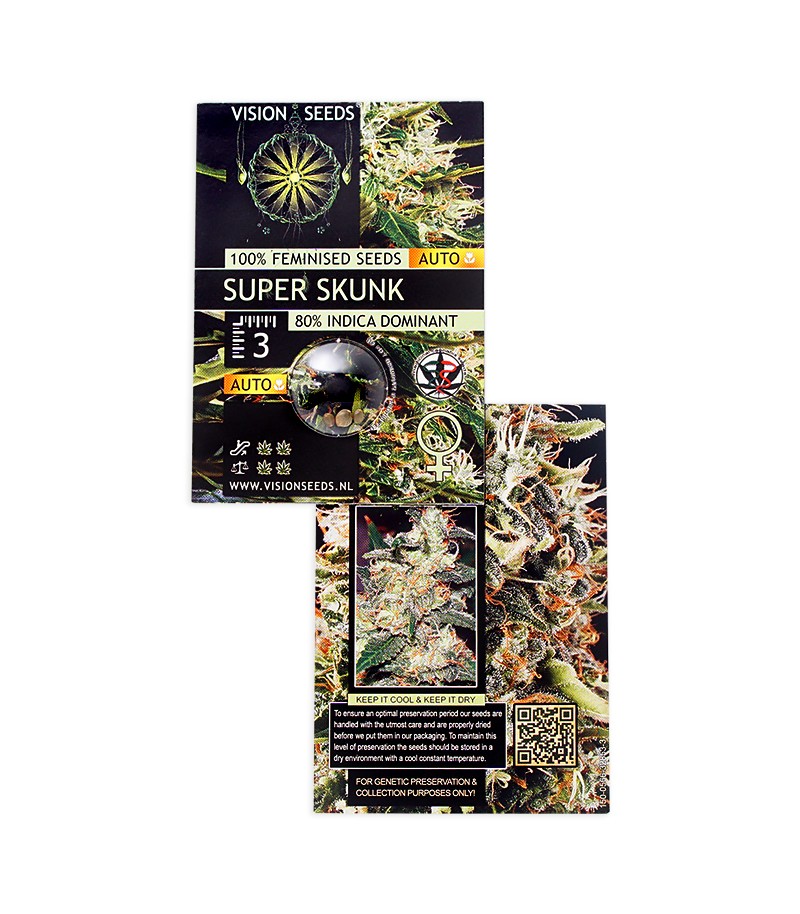 Сорт конопли Super Skunk Auto Fem от сидбанка Vision Seeds имеет богатую родословную, берущую свои корни в Афганистане. Чтобы получить новый гибрид с максимальной энергией, сильным вкусом и стоун-эффектом, генетики скрестили известные сорта Skunk №1, Afghani Hash и Ruderalis. В итоге получилось устойчивое жизнелюбивое растение, способное давать хорошие урожаи как в индоре, так и в аутдоре, при чем даже в умеренном климате.