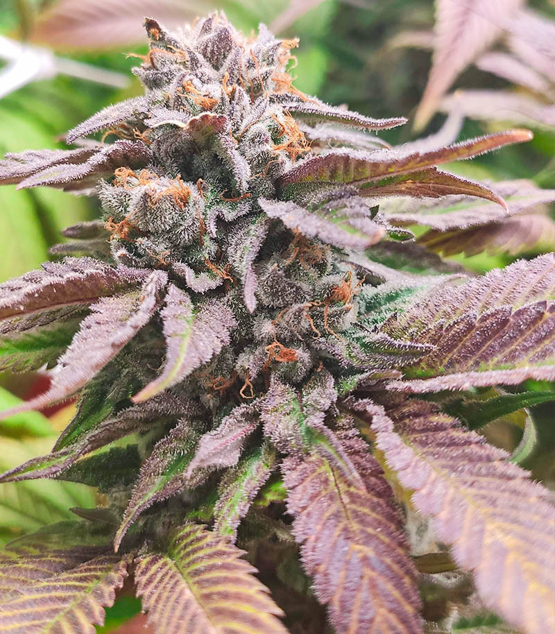 Цвет соцветий может варьироваться в зависимости от фенотипа и радует глаз яркими оттенками, переливающимися под светом всеми цветами радуги. Преимущественно доминируют фиолетовые тона, особенно в условиях понижения ночной температуры. В соцветиях содержится высокая концентрация ТГК – 27%. При этом уровень КБД составляет менее 1%.